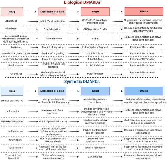 Overview of DMARDs used in RA treatment: mechanisms and effects.