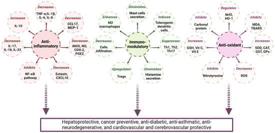 The development of RA is closely associated with oxidative stress, a condition characterized by an imbalance between the excessive production of reactive oxygen species (ROS) and the body’s insufficient antioxidant defenses. This condition contributes to inflammation, immune dysregulation, and joint damage, all of which are characteristic of RA [45]. During the inflammatory process in RA, various cells such as neutrophils, macrophages, and synoviocytes produce ROS, including superoxide anions, hydrogen peroxide, and hydroxyl radicals [46]. These ROS are known to cause damage to lipids, proteins, and DNA, leading to cell dysfunction and death [47], and activate redox-sensitive signaling pathways like NF-κB, and MAPKs, which in turn promote the production of pro-inflammatory cytokines, chemokines, and MMPs. This chain of events further worsens the inflammation and joint damage experienced by RA patients [48,49,50]. The human body combats oxidative stress through a range of antioxidant mechanisms [51]. Enzymatic antioxidants, such as superoxide dismutase (SOD), catalase, and glutathione peroxidase, play a crucial role in detoxifying ROS [52]. Non-enzymatic antioxidants, including vitamins C and E, also help neutralize free radicals [53]. Additionally, the activation of transcription factors like NRF2 stimulates the production of antioxidant proteins, enhancing the body’s resilience to oxidative stress [54]. By understanding these defense systems, we can better appreciate the therapeutic potential of promising compounds, that not only reduce inflammation but also bolster these antioxidant defenses, thereby protecting joint tissues from oxidative damage and inflammation associated with RA.