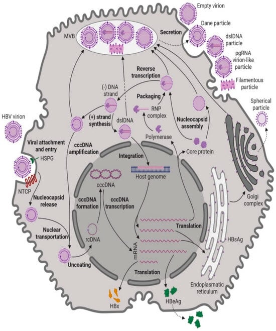 The hepatitis B virus (HBV) genome consists of four genes, namely S, C, P, and X, which collectively encode a total of seven proteins. The S gene encodes the surface envelope glycoproteins, known as hepatitis B surface antigens (HBsAgs). The S gene is divided into three domains: preS1, preS2, and S [8]. The S gene contains three in-frame “start” codons (ATG), resulting in the generation of three different-sized proteins: protein S (S), protein M (preS2, S), and protein L (preS1, preS2, and S). Notably, protein L contains the outer domain preS1, which plays a crucial role in virion infectivity, as it is responsible for binding to receptors on the surface of hepatocytes [9]. The C gene encodes the core protein (HBcAg), which is responsible for forming the viral nucleocapsid. Additionally, the C gene encodes the pre-core protein, which undergoes proteolytic processing to yield the soluble antigen HBeAg. While HBeAg is not essential for viral replication, it is considered critical for the establishment of chronic HBV infection [7]. The P gene encodes the HBV DNA polymerase, which possesses reverse transcriptase activity and is essential for viral replication. Finally, the X gene encodes protein X, a transcription regulator that plays a role in modulating viral gene expression [9,10]. These various proteins encoded by the HBV genome play essential roles in the life cycle of the virus, replication, and infection, highlighting their significance in the development and progression of hepatitis B infection. The HBV infection process involves a series of intricate steps that facilitate viral entry, replication, and persistence within hepatocytes (Figure 1). Firstly, the virus attaches with low affinity to heparan sulphate proteoglycans (HSPGs) present on the surface of the hepatocyte. Subsequently, it connects with high affinity to sodium taurocholate co-transporting polypeptide (NTCP), a carrier protein situated in the basolateral membrane of the hepatocyte, enabling endocytic entry of the hepatitis viruses [11]. During translocation within the hepatocyte, the endosome’s pH decreases, leading to the fusion of the endosomal membrane with the viral envelope and the release of the nucleocapsid [12]. The viral nucleocapsids are then transported to the nucleus, where they disassemble, releasing the HBV relaxed circular DNA (rcDNA) [13]. The rcDNA is then converted into covalently closed circular DNA (cccDNA), a stable form of episomal viral DNA that is wrapped by host histones to form a mini-chromosome [8].