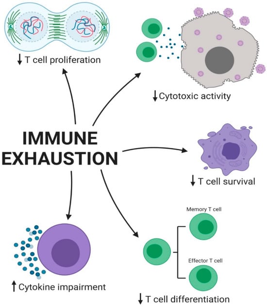 T cell exhaustion is characterized by the dysfunction and subsequent deletion of total and antigen-specific T cells during chronic viral infections and cancer [47,78]. CD8+ T cells lose effector function due to persistent stimulation, leading to immunopathologic damage and viral persistence [79]. Exhausted T cells were identified for the first time in a chronic lymphocytic choriomeningitis (LCMV) infection as virus-specific CD8+ T cells that did not secrete cytokines [78]. Loss of function happens in a hierarchical and gradual manner during exhaustion, with impaired CD8+ T cells losing their properties progressively throughout different stages [80]. Firstly, CD8+ T cells begin to lose some functions, like their proliferative capacity and ability to produce IL-2. In intermediate stages, other properties are lost, such as the production of TNF-α. Severe dysfunction leads HBV-specific T cells to partially or completely lose the ability to, for instance, secrete large amounts of IFN-γ. In the last stages of exhaustion, virus-specific T cells end up being physically deleted [81]. Moreover, a high viral load and long-term infection lead to increased expression of inhibitory surface receptors on T cells [47].