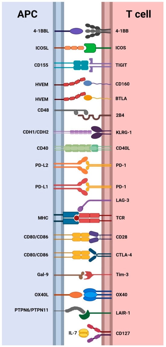 T cell responses are tightly regulated by co-stimulatory and co-inhibitory interactions, crucial for maintaining immune homeostasis and preventing autoimmunity. Immune checkpoint receptors play a vital role in balancing immune responses by providing inhibitory signals. Notably, Professor Tasuku Honjo and Professor James Allison were recognized with the 2018 Nobel Prize in Physiology or Medicine for their groundbreaking work on PD-1 and CTLA-4, respectively, in cancer research and treatment [82]. In physiological conditions, inhibitory receptors ensure self-tolerance and control excessive inflammation during infection diseases [83]. Conversely, co-stimulatory receptors activate immune cells, eliciting an efficient response against pathogens. The initiation of T cell response occurs when the T cell receptor (TCR) interacts with antigen-presenting cells (APCs) displaying an antigen–major histocompatibility complex (MHC). The subsequent ligand–receptor interactions between APCs and T cells regulate the nature of the T cell response, whether inhibitory or stimulatory [56]. These regulatory processes occur at the lymph nodes during T cell activation or in peripheral tissues and tumors.