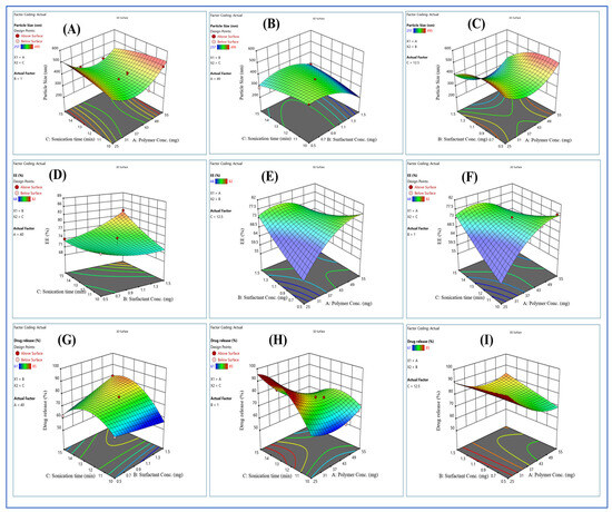 Three-D response surface plots. (A–I) Comparative effects of surfactant conc., polymer conc., and sonication time on particle size (A–C), EE (D–F), and % drug release (G–I).