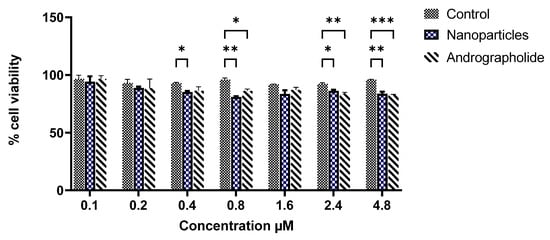 Percentage cell viability of prepared nanoparticles. *** p < 0.001. ** p < 0.1. * p < 0.05.