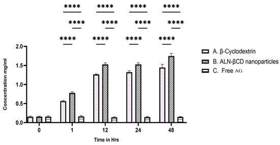 The cellular uptake of ALN-βCD nanoparticles, free AG, and lactose-appended β-cyclodextrin was measured and compared. The data obtained for cellular uptake are presented in the results. Figure 8 illustrates that cellular uptake was significantly higher for ALN-βCD nanoparticles compared to free AG and lactose-appended β-cyclodextrin. These findings suggest that ALN-βCD nanoparticles have a greater potential for cellular uptake and can potentially be utilised as effective carriers for drug delivery applications.
