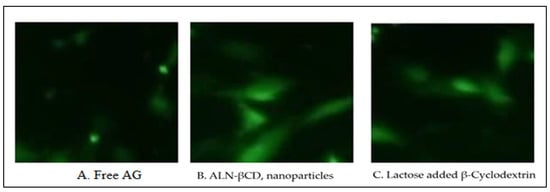 Cellular uptake of prepared nanoparticles. Free AG (A), ALN- βCD nanoparticles (B) and Lactose added β-Cyclodextrin (C).