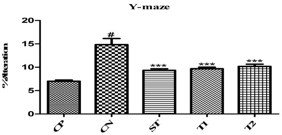 Effect of ALN-βCD nanoparticles using the Y-maze model. Data are presented as mean ± SEM (n = 6), substantially different from the Control Negative (CN) group at *** p < 0.001. # p < 0.01 vs. CP group. (Positive Control group (CP), Scopolamine Control group (CN), Standard Group (ST), Free Andrographolides (T1), ALN-βCD nanoparticles (T2)).