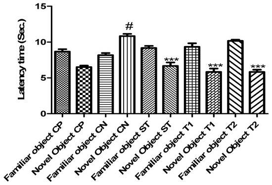 Effect of formulation on the latency time in the object recognition test. Data are presented as mean ± SEM (n = 6), substantially different from the Control Negative (CN) group at *** p < 0.001. # p < 0.01 vs. CP group. (Positive Control group (CP), Scopolamine Control group (CN), Standard Group (ST), Free Andrographolides (T1), ALN-βCD nanoparticles (T2)).