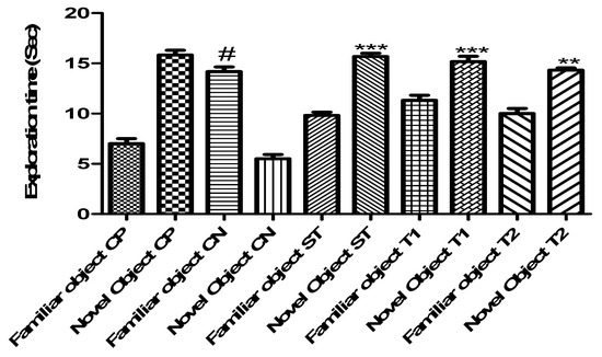 Effect of formulation on exploration time in the object recognition test. Data are presented as mean ± SEM (n = 6), substantially different from the Control Negative (CN) group at *** p < 0.001. ** p < 0.1. # p < 0.01 vs. CP group. (Positive Control group (CP), Scopolamine Control group (CN), Standard Group (ST), Free Andrographolides (T1), ALN-βCD nanoparticles (T2)).