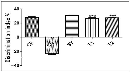 Effect of formulation on % discrimination index in the object recognition test. Data are presented as mean ± SEM (n = 6), substantially different from the Control Negative (CN) group at *** p < 0.001. vs. CP group. (Positive Control group (CP), Scopolamine Control group (CN), Standard Group (ST), Free Andrographolides (T1), ALN-βCD nanoparticles (T2)).