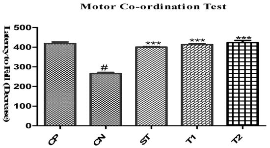 Effect of formulation on Motor coordination test. Data are expressed as mean ± SEM (n = 6), significantly different at *** p < 0.001 when compared with the Control Negative (CN) group. # indicates p < 0.01 when compared with the CP group. (Positive Control Group (CP), Scopolamine control group (CN), Standard Group (ST), Free Andrographolides (T1), ALN-βCD nanoparticles (T2)).