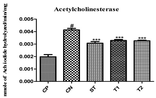 The experimental animals’ acetylcholinesterase activity was substantially reduced by ALN-βCD nanoparticles (p < 0.001), leading to an increase in the quantity of acetylcholine. The enzymatic level of T1 and T2 was 0.0032 and 0.0030 Ach iodide hydrolysed/min/mg, respectively, in comparison to the control group (Figure 16).