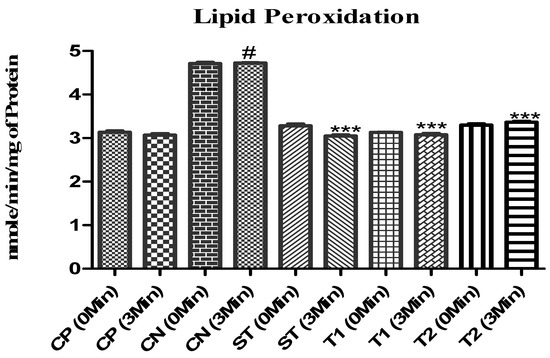 There was a significant decrease in lipid peroxidation activity (p < 0.001) following 3 min of observation. Comparing T1 and T2 to the control group, the enzymatic levels were 3.01 and 3.22 mmole/min/mg of protein, respectively (Figure 17).