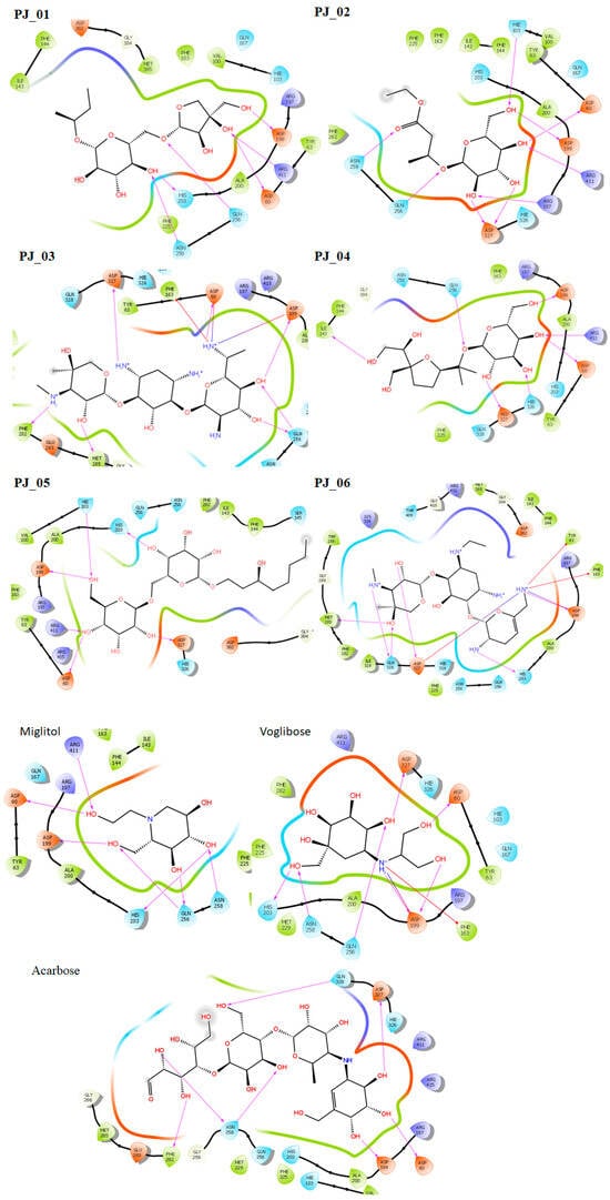 Post-docking 2D interactions of α-glucosidase (PDB ID: 5ZCC)-ligand (PJ_01, PJ_02, PJ_03, PJ_04, PJ_05, PJ_06, and control ligands).