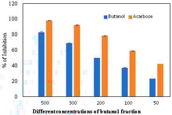 Inhibition of α-glucosidase by n-butanol fraction and known inhibitor, Acarbose.