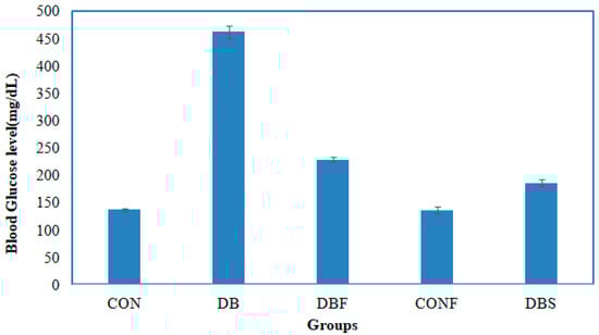A significant (p < 0.01) increased level of blood glucose was noted in the diabetes group of mice in comparison with the control group of mice. In contrast, treatment with the n-butanol fraction of the methanol extract of pods in diabetic mice significantly (p < 0.01) decreased the blood glucose levels compared to the diabetes group of mice. The blood glucose levels of control mice (CON), diabetic mice (DB), diabetic mice treated with pod extract (DBF), control mice treated with pod extract (CONF), and diabetes mice treated with the standard drug acarbose (DBS) were 137.33, 462.66, 228.66, 136.66, and 186.33 µg/mL, respectively. The changes in blood glucose levels are shown in Figure 5.