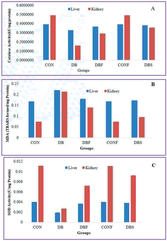 Effect of n-butanol fraction on oxidative stress in the liver and kidney of diabetic mice ((A): catalase activity, (B): superoxide dismutase, and (C): malondialdehyde). CON—control; CONF—control treated with plant fraction; DB—diabetic mice; DBS—diabetic mice treated with standard drug; and DBF—fraction-treated diabetic mice).