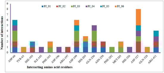 Number of interactions exhibited by selected top six inhibitors (PJ_01, PJ_02, PJ_03, PJ_04, and PJ_06) with active site amino acid residues of α-glucosidase.
