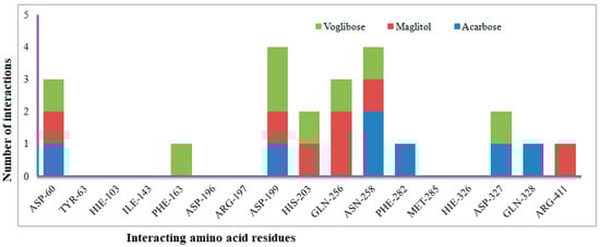 Number of interactions exhibited by selected known α-glucosidase inhibitors Voglibose, Miglitol, and Acarbose with active site amino acid residues.
