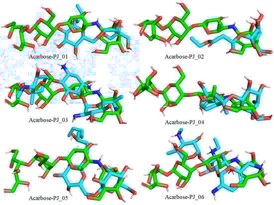 Docked pose of compounds PJ_01, PJ_02, PJ_03, PJ_04, PJ_05, and PJ_06 (cyan color) superimposed on the docked pose of known inhibitor Acarbose (green color) in the active site of α-glucosidase.