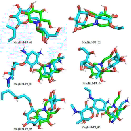 Docked pose of compounds PJ_01, PJ_02, PJ_03, PJ_04, PJ_05, and PJ_06 (cyan color) superimposed on the docked pose of known inhibitor Miglitol (green color) in the active site of α-glucosidase.