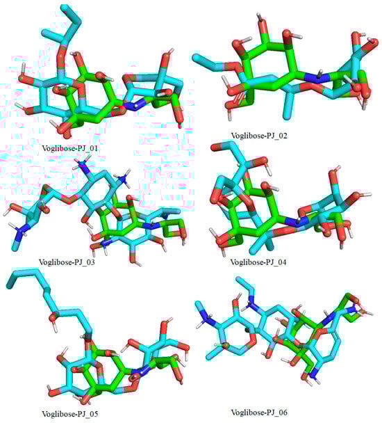 Docked pose of compounds PJ_01, PJ_02, PJ_03, PJ_04, PJ_05, and PJ_06 (cyan color) superimposed on the docked pose of known inhibitor Voglibose (green color) in the active site of α-glucosidase.