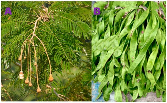 Photographic representation of the tree (A) and pods (B) of P. javanica.