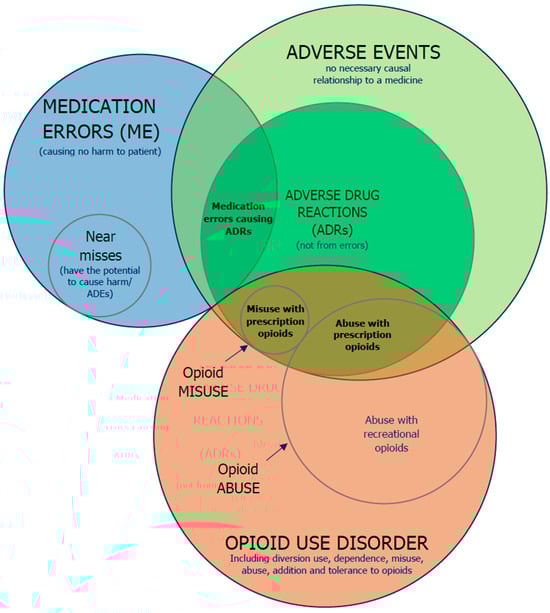 A Venn diagram showing the relation among adverse events, ADRs, medication errors and opioid use disorder; the sizes of the plots do not reflect the relative frequencies of the events illustrated. Illustration supported on the research of previous authors [14,15,16,17,18].