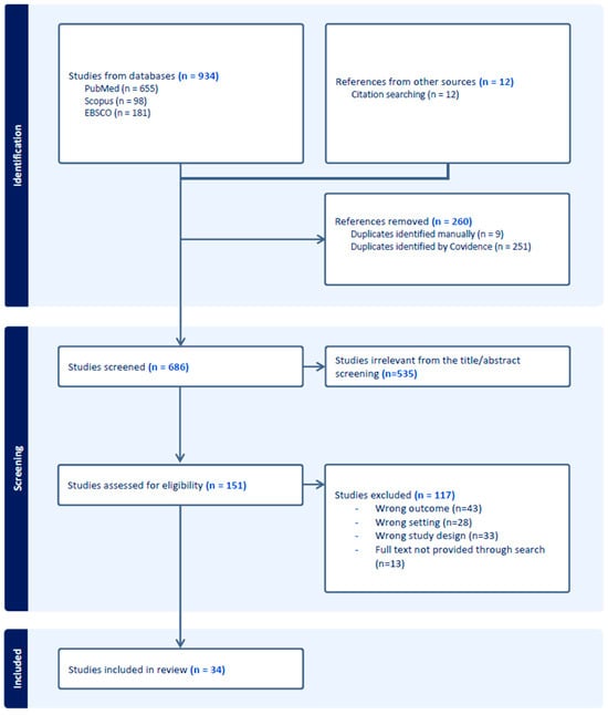 The Covidence® software (https://www.covidence.org/) was used to screen, select, and extract data from the articles. Covidence® was chosen because it improves evidence synthesis by enhancing the efficiency of the systematic review. The software mirrors the multiphase review process, including data extraction, directly in its design [46]. Imported duplicates were automatically removed by the software. A title and abstract screening were performed by two independent reviewers (MG and VS), and disagreements were resolved between the two parties or by discussion with a third reviewer (CV). The included articles from the abstract and title screening were subjected to a full text review. Articles were excluded based on criteria such as incorrect outcome, incorrect study design, incorrect setting, or because full-text was not possible to obtain. The data extraction was performed according to the data extraction table (see Supplementary Materials Table S5) by two authors (MG and VS) and reviewed by a third author (CV). Figure 2 represents the preferred reporting items for systematic reviews and meta-analysis flow diagram.