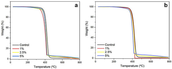 Thermogravimetric analysis of nanofibers produced with PCL and KH. Samples of 10% PCL nanofibers (a), and 15% PCL nanofibers (b) functionalized with 1%, 2.5%, and 5% KH were subjected to these analyses.