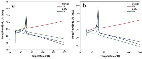 Differential scanning calorimetry analysis of nanofibers produced with PCL and KH. Samples of 10% PCL nanofibers (a), and 15% PCL nanofibers (b) functionalized with 1%, 2.5%, and 5% KH were subjected to these analyses.