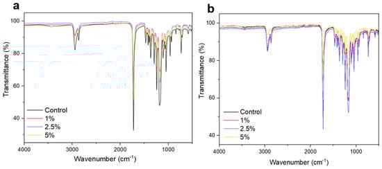 FTIR spectra of nanofibers composed of 10% PCL (a) and 15% PCL (b). Control (black); 1% KH (pink); 2.5% KH (blue); and 5% KH (yellow).