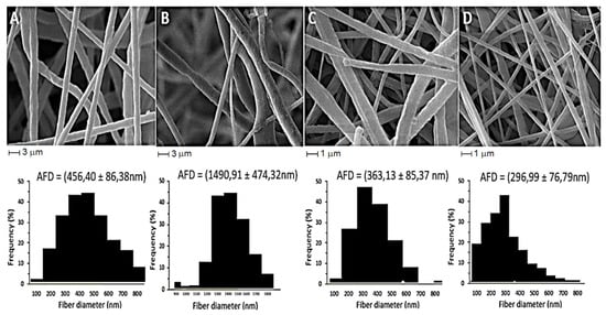Scanning electron microscopy of 15% PCL nanofibers loaded with 5% bioactive keratin hydrolysate (KH) (A) compared with the respective control prepared with only the polymer in the same concentration (B). SEM images of 10% PCL nanofibers loaded with 5% KH (C) and nanofiber control 10% PCL (D). The histograms of the diameter distribution of nanofibers are presented below each SEM image.