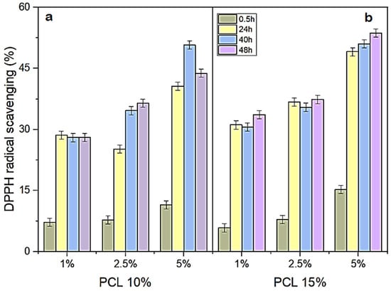 Scavenging of the DPPH radical from nanofibers composed of 10% PCL (a) and 15% PCL (b). All nanofibers tested were functionalized with different concentrations of bioactive keratin hydrolysate (1, 2.5, and 5%). Data represent the mean ± standard deviation of three independent experiments.