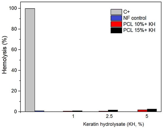 Hemolytic activity evaluation of PCL nanofibers functionalized with bioactive keratin hydrolysate (KH) at different concentrations (1, 2.5, and 5% KH) compared with PCL nanofibers without KH (PCL control). Triton X-100 was used as positive control (C+) and was considered as 100% hemolysis. Results are the means ± standard deviations of three independent experiments.
