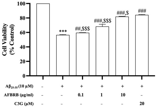 To investigate the effects of AFBRB or C3G against Aβ25–35-induced cell death, SK-N-SH cells were pretreated with 0.1, 1, or 10 µg/mL of AFBRB or 20 µM of C3G for 2 h before the addition of 10 µM of Aβ25–35 for 24 h. The results showed the Aβ25–35-induced cell death of approximately 56.52 ± 0.50% of cells when compared with the control group. Treatment with AFBRB or C3G can attenuate the cytotoxicity of Aβ25–35 and significantly increase cell viability in a dose-dependent manner. The percentage of cell viability upon pretreatment with AFBRB at concentrations of 0.1, 1, or 10 µg/mL or 20 µM of C3G before being treated with Aβ25–35 was 59.62%, 68.29%, 81.92%, and 84.32%, respectively, as shown in Figure 1.