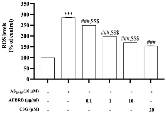 The levels of intracellular ROS production were evaluated in Aβ25–35-induced SK-N-SH cells. Cells were pretreated with AFBRB or C3G for 2 h before the addition of 10 µM of Aβ25–35 for 24 h. Results showed that Aβ25–35 alone significantly increased the levels of ROS by approximately 285.90% compared with the control group. Pretreatment with AFBRB at concentrations of 0.1, 1, or 10 µg/mL or 20 µM of C3G significantly reduced the levels of production of ROS in a dose-dependent manner (Figure 2).