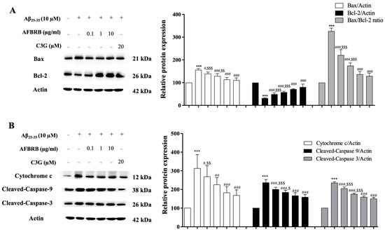 The protective effect of AFBRB and C3G on the Aβ25-35-induced mitochondrial death pathway in the SK-N-SH cells. The representative of AFBRB and C3G protected the upregulation of the Bcl-2, cytochrome c, cleaved caspase-9, and cleaved caspase-3, and the downregulation of Bax was determined using the Western blot analysis. The quantitative results of (A) Bax, Bcl-2, and Bax/Bcl-2 ratio and (B) cytochrome c, cleaved caspase-9, and cleaved caspase-3 proteins are displayed. Reprobing for β-actin served as the internal loading control. The data are expressed as mean ± SD of six independent experiments. *** p < 0.001 versus control group; # p < 0.05, ## p < 0.01, and ### p < 0.001 versus 10 µM Aβ25–35-treated group; $ p < 0.05, $$ p < 0.01, and $$$ p < 0.001 versus C3G.