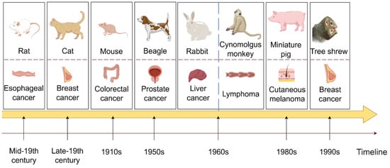 In the early 18th century, rats were first domesticated and subsequently utilized in animal experiments during the mid-19th century. Currently, rats play a crucial role in life science, medical research, and healthcare. They are the second most commonly used mammalian experimental animals after mice. Esophageal cancer is a prevalent and highly incident malignant tumor of the digestive tract. Rats’ anatomical and physiological similarities have been leveraged for studying esophageal cancer in its early stages. Moreover, rat models are employed in researching treatments for various cancers, such as breast cancer and acute myeloid leukemia [,]. Cats, known as domestic pets, have been utilized as experimental animals since the late 19th century. Sherrington’s stretch reflex experiment not only advanced people’s understanding of movement but also established cats as valuable experimental subjects across various fields of research. In oncology, early-stage cats are commonly used as representative models for aggressive breast cancer, and recently, preclinical cat models of head and neck squamous cell carcinoma have been under investigation [,]. Mice are widely recognized as the most commonly utilized preclinical experimental animals globally. The DBA strain of mice was first introduced in the 1910s, and various strains have been developed since then. CRC is among the most frequently diagnosed and severe cancers, ranking within the top three worldwide in terms of cancer statistics. The mouse model of colorectal cancer can replicate the occurrence and progression of human colorectal cancer, holding significant theoretical value and clinical importance in studying disease mechanisms, discovering new drug targets, and evaluating preclinical pharmacodynamics. It is now almost universally employed in studies involving various types of cancer tumors in mouse models, underscoring its significance. Beagle dogs have been utilized in animal experimental research since the 1950s due to their small size, gentle temperament, consistent response, high reproducibility, well-developed brain, and strong adaptability. They are extensively employed in biological and medical research, particularly in non-clinical drug studies. Prostate cancer is among the most prevalent malignant tumors in the genitourinary system of middle-aged and elderly men. Due to its anatomical similarity to humans and responsiveness to treatment, beagles have been widely used as a model for hormone-induced benign prostatic hyperplasia (BPH) research []. Beagle dogs have also been selectively bred for various tumor models, including thyroid cancer and breast cancer, and continue to play a pivotal role in toxicology experiments [,]. In 1959, Wostomalm successfully achieved the first breeding of sterile rabbits through cesarean section uterine extraction and artificial lactation. Various grades of experimental rabbits were established and widely utilized in scientific research and product quality verification. The Rabbit VX2 tumor model is a commonly used transplantation tumor model, and new research suggests that rabbits can also serve as a model to simulate the occurrence and development of osteosarcoma [,]. In the 1960s, the newly established Kunming Institute of Zoology founded a primate domestication and breeding center for scientific research, focusing on cynomolgus monkeys. Cynomolgus monkeys, as non-human primates closely related to humans, have been extensively utilized in various studies. Their application extends to pharmacokinetic research on bispecific antibodies in lymphoma and the development of antibody-drug conjugates (ADCs), thereby broadening their potential applications in fields such as breast cancer [,]. Due to the physiological and anatomical similarities, nutrient metabolism, biochemical indexes, and other characteristics shared between pigs and humans, particularly in the structure of the cardiovascular system, which closely resembles that of humans, pigs are considered ideal experimental animals. Miniature pigs were initially utilized in medical research in Europe before being introduced to the United States in the 1980s. An American Sinclair miniature pig strain was found to develop spontaneous cutaneous melanoma in 80% of the animals, making it a long-standing model for cutaneous melanoma []. Research by Niels et al. demonstrated that miniature pigs could also be valuable in studying prostate cancer and assessing growth distribution []. Tree shrews, being small mammals approximately the size of laboratory rats and close relatives of primates, are anticipated to supplant nonhuman primates in certain biomedical research and applications due to their short reproductive cycle, low feeding cost, and large single-litter size. Phylogenetically closer to humans and prone to spontaneous breast cancers, tree shrews hold significant potential for breast cancer research owing to their closer genetic relationship with humans. As mentioned earlier, the tree shrew breast cancer model has been utilized for gene editing therapy. The discovery of Lipid nanoparticles (LNPs) delivery system based on SM-102 could serve as a promising treatment strategy against hepatitis B virus (HBV) infection, effectively preventing liver cancer [].