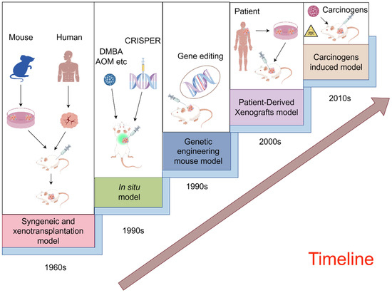 With the progress of technology and theory, preclinical animal models continue to break through their limitations and evolve into more diverse types. In the case of mice, applications are expanding from simple transplantation models to complex in vivo gene editing and orthotopic modeling [,]. A schematic illustration of the evolution of preclinical mouse animal models for cancer therapy is provided in Figure 2 [,,,,,,]. To illustrate, we introduce and summarize five prevalently employed mouse models, underscoring their significance in the field.
