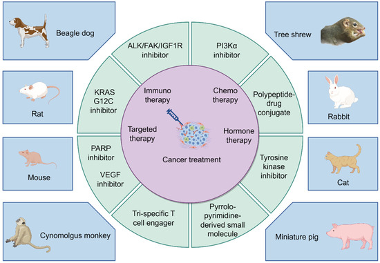 Before progressing to human trials, drug candidates must undergo a rigorous and comprehensive evaluation process to assess their potential for acute, chronic, developmental, and reproductive toxicity and carcinogenicity. This exhaustive examination is imperative to guarantee the efficacy and safety of the drugs post-administration, ensuring that they meet the highest standards of patient care and well-being [,]. Preclinical studies focusing on clinical pharmacology [], pharmacokinetics [], and toxicology are conducted in small animals or at the cellular and molecular levels to predict potential effects of chemicals on humans []. Furthermore, preclinical studies can also determine the maximum tolerable dose for human clinical trials in order to minimize risks []. The establishment of preclinical animal models offers researchers with a multi-dimensional understanding of cancer development. These models provide a more comprehensive insight into cancer characteristics than traditional cell culture methods []. Selecting appropriate animal models not only maximizes disease replication but also eliminates ethical concerns associated with human experiments []. These models have proven crucial in various aspects, including pinpointing effective sites for cancer therapy [], facilitating the real-time analysis of signaling pathways during tumor treatment [], enhancing early cancer detection and prevention strategies [], assessing the toxicity of biochemical agents [], and advancing the clinical application and development of novel drugs. This paper provides a detailed description of the application of preclinical animal models in cancer therapy, covering the establishment and classification of models, recent research progress, development of new drugs based on biological characteristics at different stages of tumor development, guidance for personalized anti-cancer therapy, and targeted selection in safety evaluation experiments. The objective of this review is to facilitate researchers in the selection of suitable preclinical animal models for experiments and to promote the enhancement and development of optimized preclinical animal models while adhering to pertinent laws, regulations, and ethical principles regarding animals.