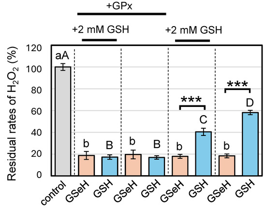 Selenium is an essential micronutrient for animals as a source of selenocysteine (Sec), which is incorporated into the active site of several enzymes, such as GPx. GPx is an antioxidant enzyme that catalyzes the reduction of hydroperoxides utilizing GSH [2,19]. The enzymatic reactions of GPx have been well studied, and numerous GPx mimics have already been developed for potential applications as antioxidant drugs [20,21,22,23,24,25,26]. Previously, the GPx-like activity of GSeSeG was assayed in the presence of H2O2, NADPH, and GR. The reduction rate of H2O2 by GSeSeG was indirectly measured by monitoring the decrease in the UV absorbance of NADPH at 340 nm [10]. In contrast, the present study directly measured the reduction rate of H2O2 by employing the FOX assay, a common method for determining H2O2 concentration in a sample solution [27]. Here, GSeH was first generated from GSeSeG in the presence of NADPH and GR (see Figures S1 and S2). The generated GSeH (ca. 89% conversion) was then reacted with H2O2. Figure 1 shows the residual rates of H2O2 under the various assay conditions.