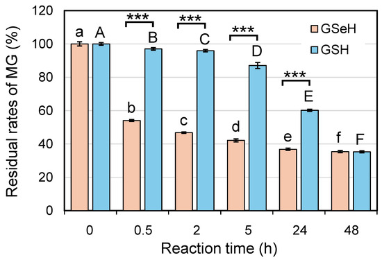 GLO 1-like MG degradation activities of GSeH and GSH, which were in situ-generated from GSeSeG and GSSG, respectively, in the presence of GR and NADPH. The assays were performed by mixing the resulting 1 mM GSeH or GSH solution with the same volume of the PBS solution containing 1 mM MG at 37 °C for 48 h. The amounts of residual MG were determined by reacting an aliquot of the assay solution with 1 mM MDB to derivatize to the MG–MDB adduct. The percentage of residual rates of MG was estimated by the fluorescence intensities with excitation and emission wavelengths at 355 and 393 nm, respectively, as a function of the reaction time. The data are shown as mean ± SD (n = 5). See the experimental section for details of the assay conditions. Lowercase letters indicate statistical differences observed in the one-way ANOVA/Newman–Keuls test for comparisons among the GSeH groups, while uppercase letters indicate statistical differences observed in the one-way ANOVA/Newman–Keuls test for comparisons among the GSH groups. Bars sharing the same letter are not significantly different according to one-way ANOVA and the post hoc Newman–Keuls test, while different letters represent a statistical significance (p < 0.05). A t-test was also performed to evaluate the statistical difference between the GSeH and corresponding GSH data (*** p < 0.001).
