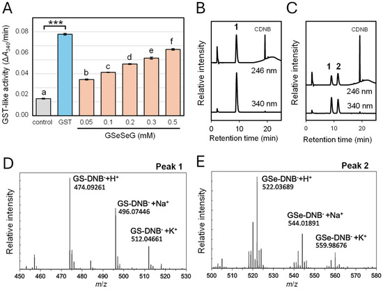 The GST-like activity of GSeSeG using CDNB as a model substance. (A): Formation rates of GSH–CDNB conjugate, estimated by the absorption change at 340 nm over 10 min. The assay solutions contained 2 mM GSH, 1 mM CDNB, and 0.15 units/mL GST or 0.05 to 0.5 mM GSeSeG in a 0.1 M sodium phosphate buffer solution at pH 6.9. The activities are shown as mean ± SD (n = 3). Bars with a different letter are significantly different from each other according to one-way ANOVA and the post hoc Newman–Keuls test (p < 0.05). Asterisk symbols represent a significant difference between two groups by the t-test (*** p < 0.001). (B,C): RP-HPLC charts detected by the UV absorbance at 246 and 340 nm for the assay solutions of GST (0.15 units/mL) and GSeSeG (0.3 mM), respectively. (D,E): ESI(+)-TOF-MS spectra for peaks 1 and 2, respectively, observed in the HPLC charts of B and C. See the experimental section for the details.