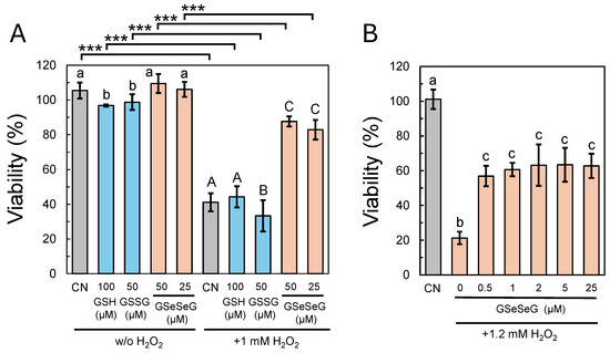 Viability assays of HeLa cells against H2O2. (A): The cells were pre-treated with GSH (100 μM), GSSG (50 μM), or GSeSeG (25 or 50 μM) and then incubated in the absence or presence of H2O2 (1.0 mM). (B): The cells were pre-treated with GSeSeG (0 to 25 μM) and then incubated in the presence of H2O2 (1.2 mM). CN: controls. The viabilities are shown in percent as mean ± SD (n = 3 or 4). See the experimental section for details of the assay conditions. For panel (A), lowercase letters indicate statistical differences observed in the one-way ANOVA/Newman–Keuls test for comparisons among the groups without H2O2, while uppercase letters indicate statistical differences observed in the one-way ANOVA/Newman–Keuls test for comparisons among the groups with 1 mM H2O2. Bars sharing the same letter are not significantly different according to one-way ANOVA and the post hoc Newman–Keuls test, while different letters represent a statistical significance (p < 0.05). Asterisk symbols represent a significant difference between two groups by the t-test (*** p < 0.001).