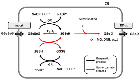A plausible mechanism for the detoxification of stress-causing materials, such as H2O2, MG, CDNB, etc., in cells is summarized in Figure 6. Although the mechanisms for the incorporation of GSeSeG into cells and the efflux of the GSeH conjugates as end-products outside the cells are not clear, GSeSeG degrades the stress-causing materials in the activated GSeH form, which is generated either through an enzymatic or non-enzymatic pathway. The reaction of GSeH with H2O2 regenerates GSeSeG, while the reactions with MG and CDNB generate the GSeH conjugates through the non-enzymatic path. Thus, the plausible mechanism of GSeSeG involves several non-enzymatic reactions, which is in significant contrast to the reactions of the sulfur counterpart, i.e., GSSG [2,3,4]. In the case of GSSG, the activation to GSH is catalyzed by GR, and the reactions with MG and CDNB are mostly catalyzed by GLO 1 and GST, respectively. The difference is due to the higher redox reactivity of selenium than that of sulfur. Thus, GSeSeG has unique features as an anti-stress agent and would have advantages in biological applications.