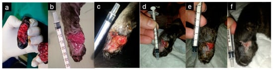 A part of the leg of a 1-year-old female was cat cut off by a lawnmower. The wound healed completely by the second intention with the use of medical honey. The sterile syringe was used as a scale for later wound size assessment. The leg on the day of presentation (a), 7 days (b), 11 days (c), 19 days (d), 24 days (e), and 30 days later (f). Medical grade honey was applied to the wound daily for the first 10 days and thereafter every 2–3 days (Original photo, V. Erjavec).