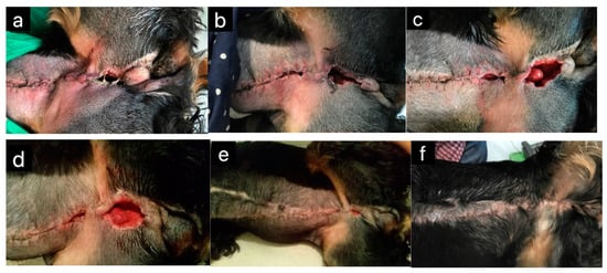 Dehiscence after unilateral mastectomy in a 12-year-old bitch: (a) on the day of presentation; (b) two days after presentation; (c) four days after presentation; (d) 14 days after presentation; (e) 21 days after presentation; (f) two months after presentation. Medical-grade honey was applied to the wound daily by the owner (Original photo, V. Erjavec).