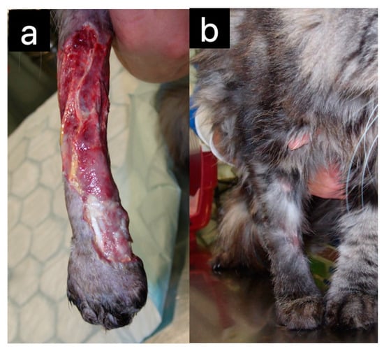 Complete skin loss across 100% of an 8-year-old female cat’s forelimb (a) healed completely with minimal scarring (b) using medical honey [6]. (Original photo, V. Erjavec).