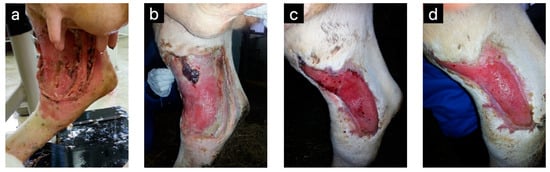 An extensive wound on a cow’s rare leg was successfully healed with raw honey, not medical-grade honey. An infected wound with necrotic material and surrounding erythema on the first day of treatment (a), wound covered with some necrotic tissue and pus 14 days later (b), the wound is almost clean, has contracted, is covered with granulation tissue (c) and is epithelializing from the margins (d) 1.5 and 2.5 months later (Original photos donated by Clinic of ruminants, Veterinary Faculty, University of Ljubljana).