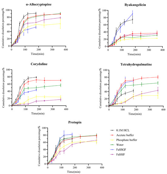 Dissolution profiles of protopin, α-allocryptopine, byakangelicin, tetrahydropalmatine, corydaline in YZTs in different media (0.1 M of HCl, acetate buffer, phosphate buffer, FaSSIF-V2, and FaSSGF n = 6).
